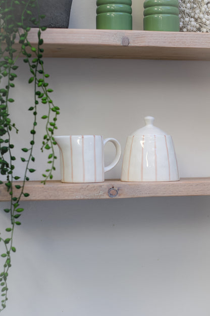 Add a touch of charm to your home with this Chalk pink striped jug and jar set. Featuring a beautifully delicate chalk pink striped design and an organic ceramic shape, this set is both stylish and practical. Its subtle tones and timeless design make it a versatile addition to your home.