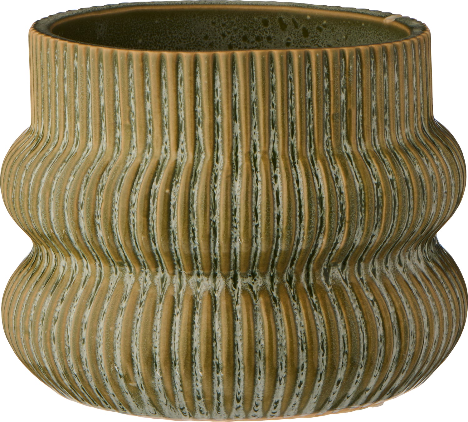 Add rustic charm to your space with this distressed green grooved planter. Its curved, rounded shape brings a soft, organic feel. The grooved, ribbed detailing adds texture, making it a true statement piece.