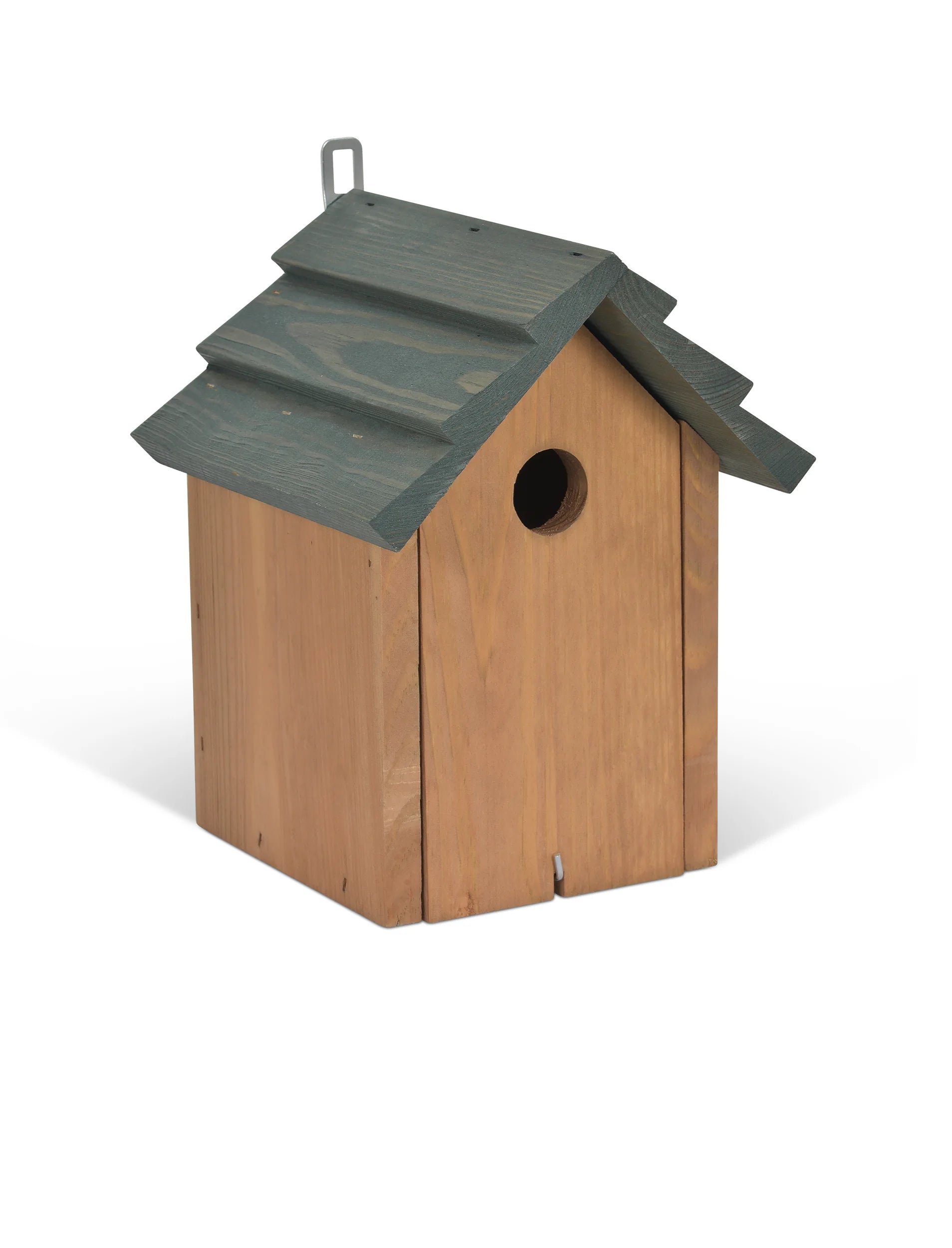 This olive green wooden bird house suits sparrows, small birds, and other small species. It features a spacious entrance hole that welcomes new feathered tenants. Additionally, the sturdy pine construction ensures years of weather-resistant performance. Furthermore, its natural grain shows unique patterns. The attached bracket allows quick mounting on trees or walls.