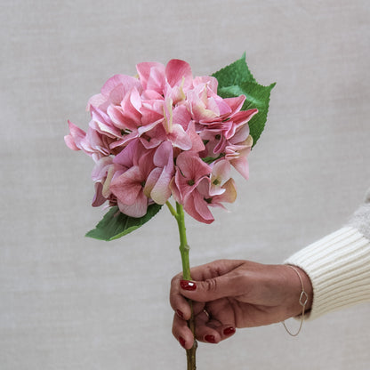 Bring a touch of charm to your home with this beautiful Faux Shabby Pink Hydrangea stem! Its lifelike qualities and pink tones will brighten up any room, creating an inviting atmosphere perfect for family and friends. Add that perfect finishing touch to your home.